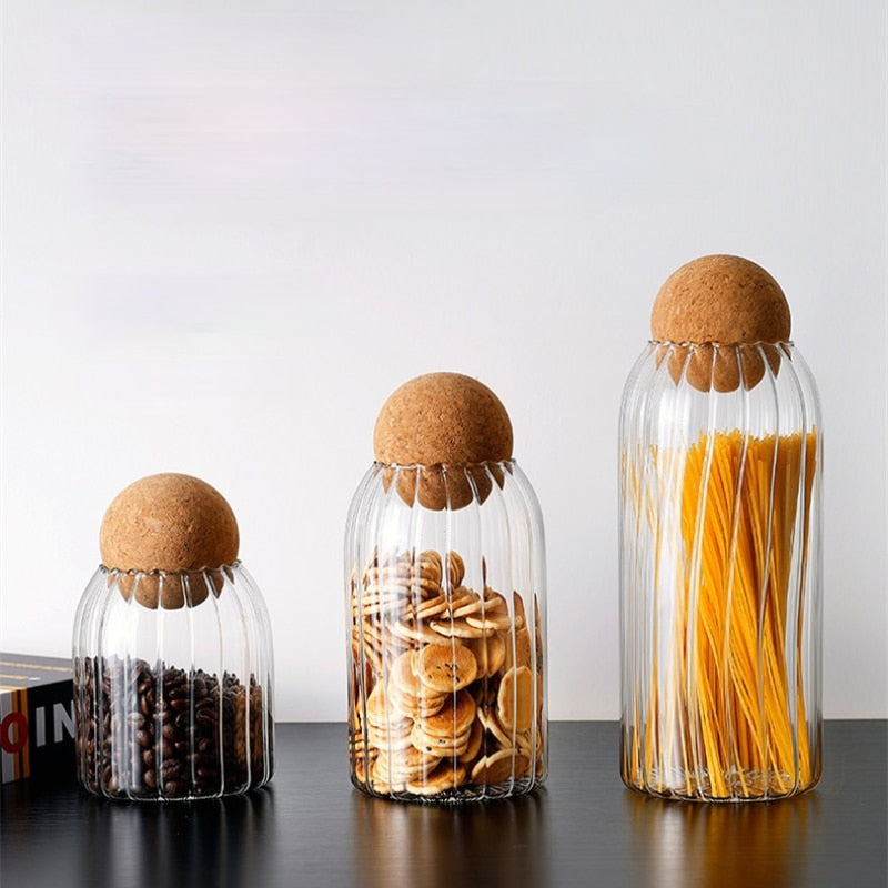Uncork great design with our Autumn Cork Ridged Glass Storage Jars. These chic, ridged glass storage jars are an easy way to keep goods fresh while adding style to your kitchen. Our glass jars have an elegant look and a modern round cork lid. They would make a stylish addition to a kitchen counter holding dried goods like sugar, salt, cookies, pasta, spices, nuts, teas, beans and other pantry staples. There are so many possibilities! Our multi-functional glass storage jars are also ideal for holding office essentials like paperclips, pens, rolls of tape or crafting supplies. Each jar makes a great catch-all on a desk or an entryway table. Beautifully crafted of transparent glass, our Autumn Cork Ridged Glass Storage Jars add a touch of elegance to a home or cottage. Too lovely to tuck away in a kitchen pantry, our storage jars work double duty as practical storage and pretty décor.