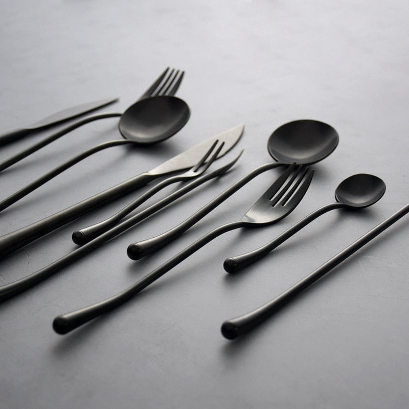 Dramatic, sculptural, and unapologetically bold—our Stein Black Finish Stainless Steel Flatware brings a moody edge to modern dining. Each piece is crafted with a sleek, elongated silhouette and a brushed black finish that feels both luxurious and minimalist. Designed to elevate any tablescape, this flatware set transitions effortlessly from everyday meals to special occasions, turning even the simplest dish into a moment of style. It’s the perfect pairing of utility and avant-garde design for those who like their dinnerware with a side of attitude.