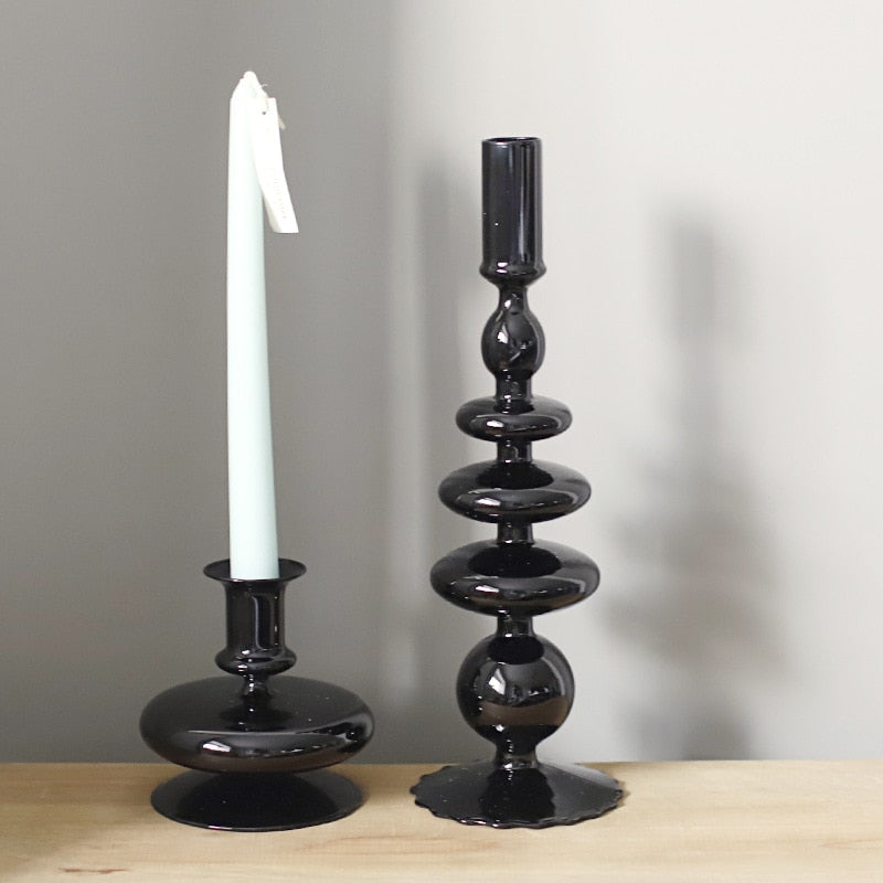 Nothing could be more elegant than black candle holders, unless of course they are crafted in glass. Sleek and sophisticated, our All Black Glass Candle Holders are the ultimate decorative accessory to add a polished look to your home. Beautifully crafted of high-quality glass and crystal, these striking candle holders are designed to capture attention. Use our gorgeous glass candle holders with taper candles to illuminate your dining table. They’re equally stunning displayed just the way they are as works of art in a living room, dining room or bedroom. Decorative as well as lovely, each candle holder has a unique silhouette that complements the other holders. Group several together to create a stunning display at the center of your dining table, along a fireplace mantel or on a table in the entryway. As a single centerpiece or part of an elegant tablescape, these All Black Glass Candle Holders captivate. What a fabulous wedding, engagement or housewarming gift.