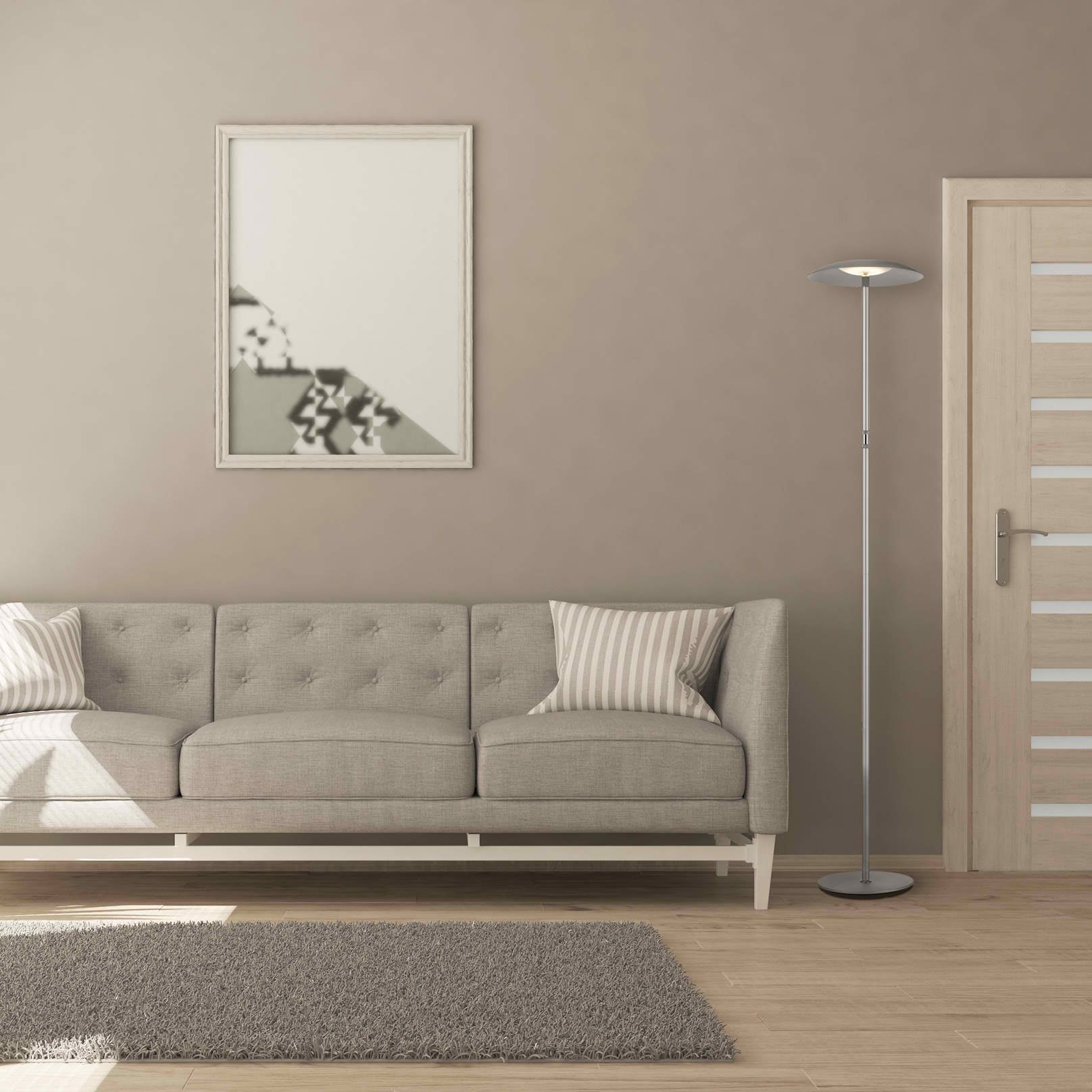 The slender Mantis provides warm light in your indoor space without taking much room, and its head easily pivots so that you can angle the light to meet your needs. Its weighted base and sturdy design make it wobble free and safe to have around children and pets. Get a torch floor lamp for your indoor space that provides generous light when you want, and allows dimming when you don't. The built-in touch switch dimmer on the pole just needs to be brushed gently to turn on, dim, and turn off. LED lights endure for more than 20 years because they don't waste energy like fluorescent, halogen, and incandescent bulbs. You'll never have to replace a bulb because the technology is just that much better. The LEDs have a color temperature of 3,000K warm white.