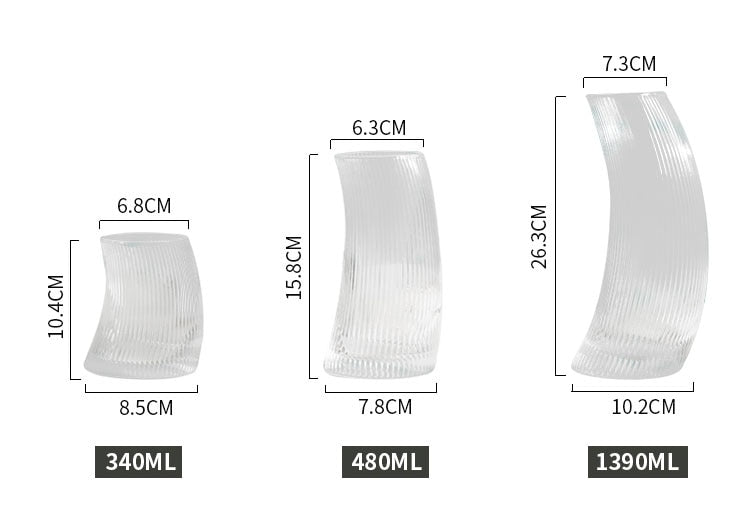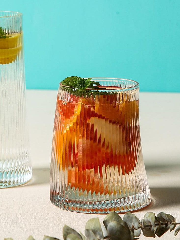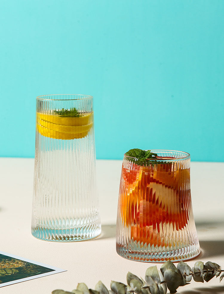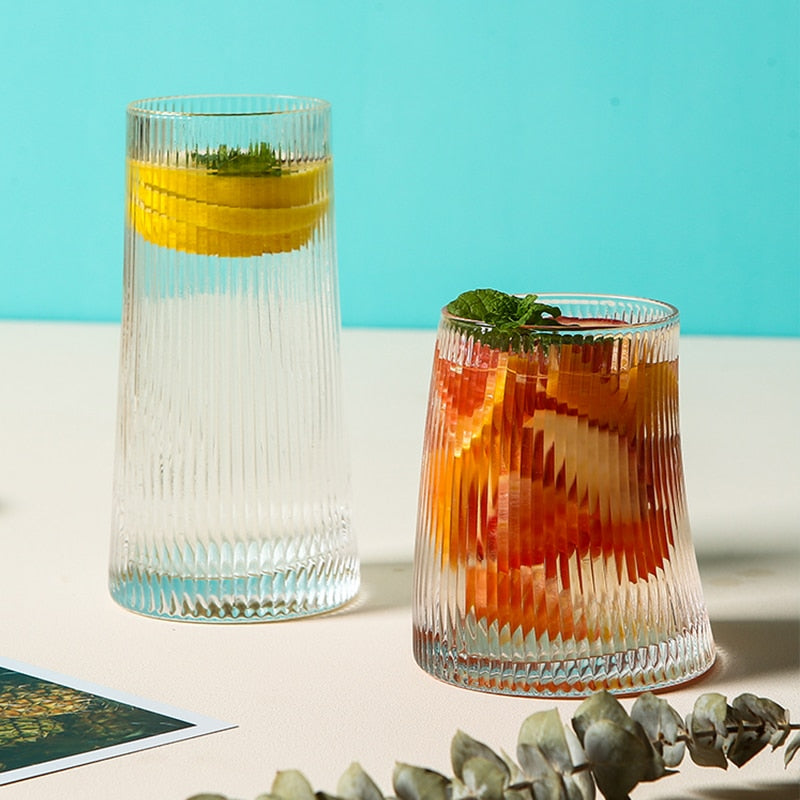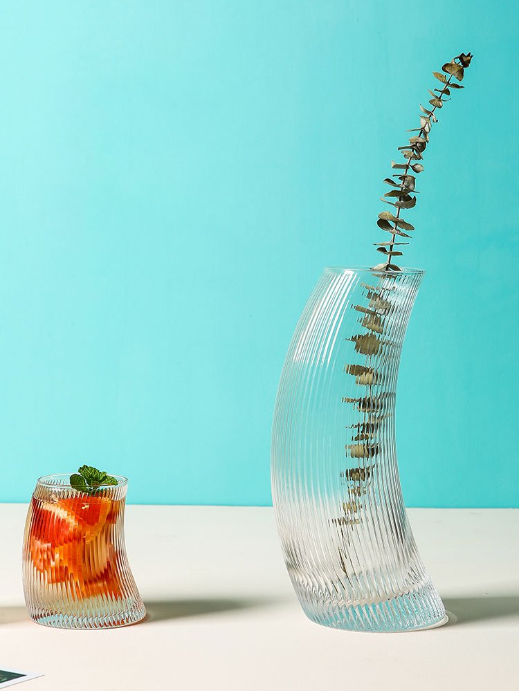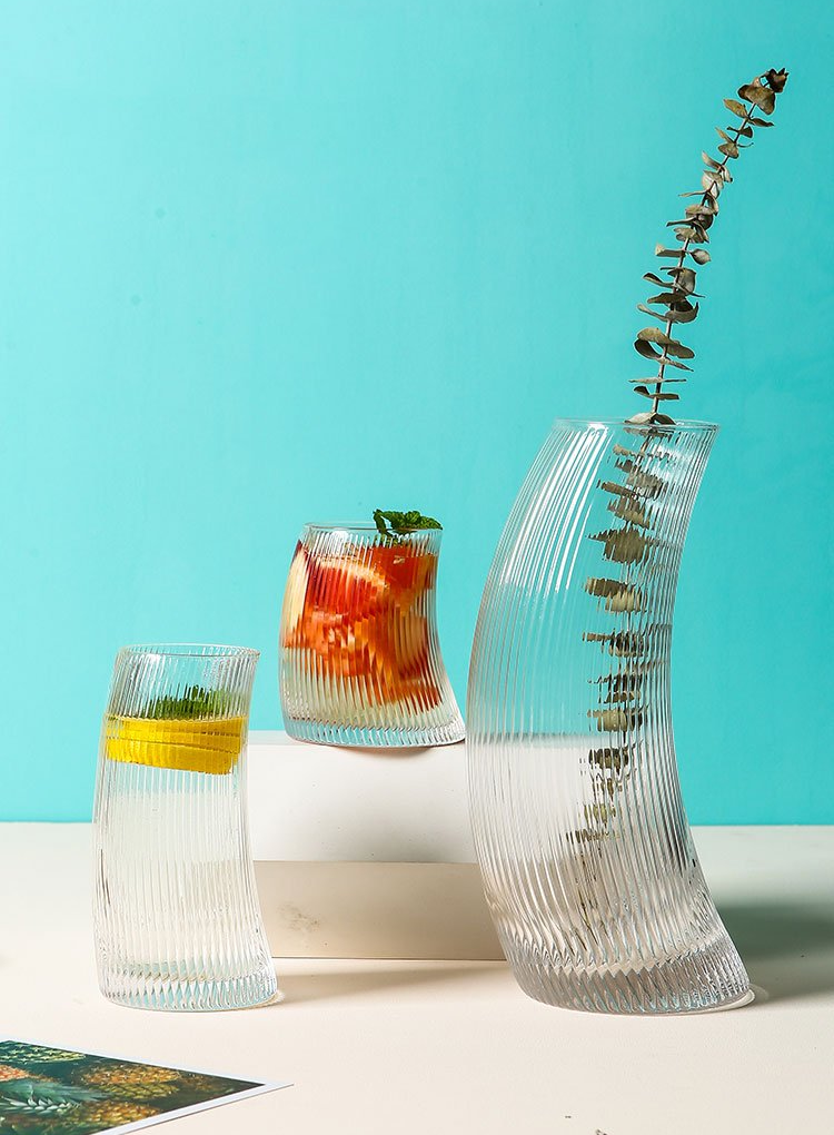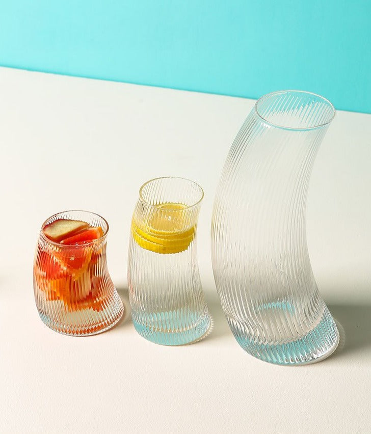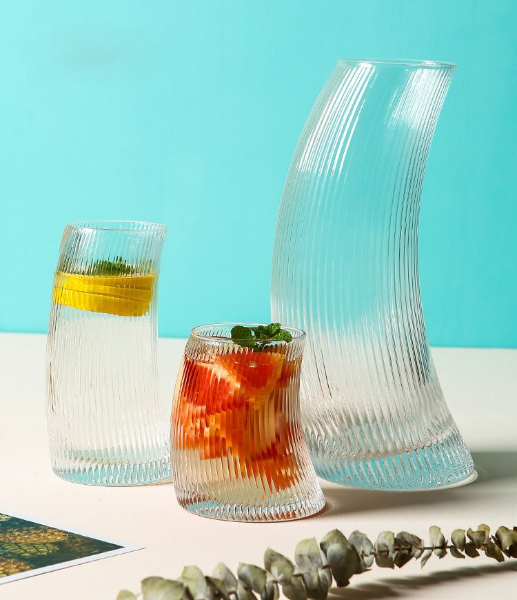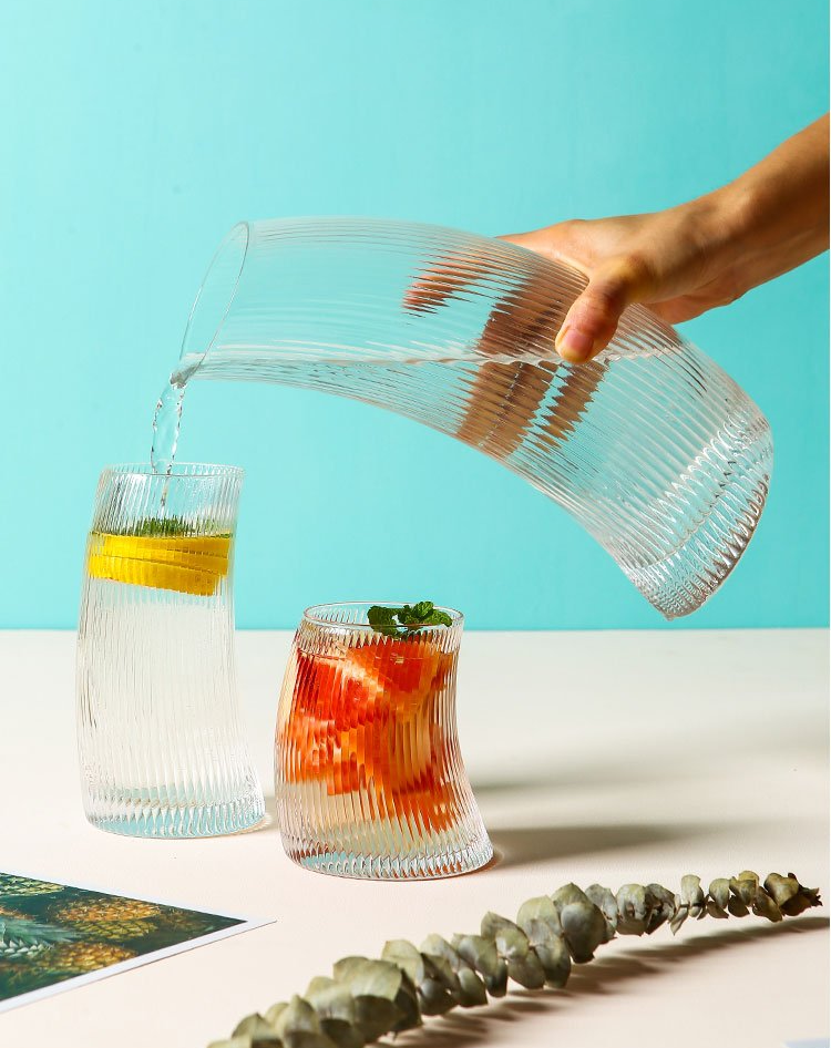 While they may appear to be perfectly imperfect, this modern Borosilicate water jar and glass set has a dynamic shape and sophisticated style, purposely designed to capture attention. This stunning set has sophisticated texture created by the vertical ripples that reflect the light from all angles. Visually appealing, both glasses have a unique shape and size, adding to the beauty of the entire set. Purchase the jar and glasses separately or go for the maximum effect and purchase the trio.