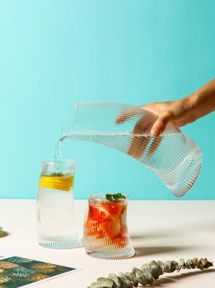 Serve water in style with this uniquely shaped textured water jar and glass set. Crafted from borosilicate heat resistant glass, the modern design of this set is sure to make a statement on any countertop.
