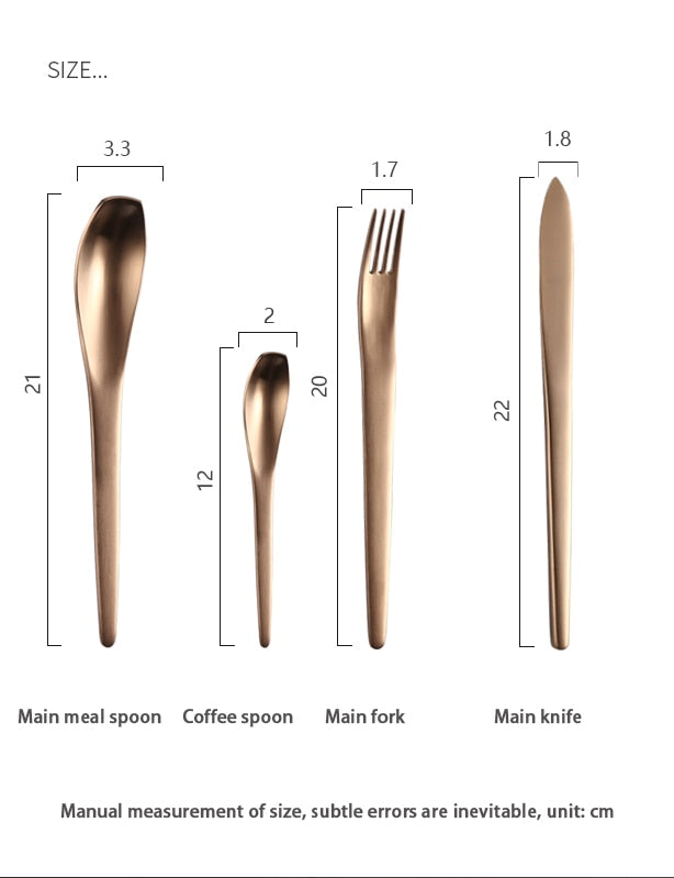 - 4PCS/SET (no gift box): 1x dinner knife, 1x dinner fork, 1x dinner spoon, 1x teaspoon