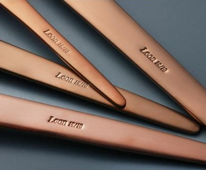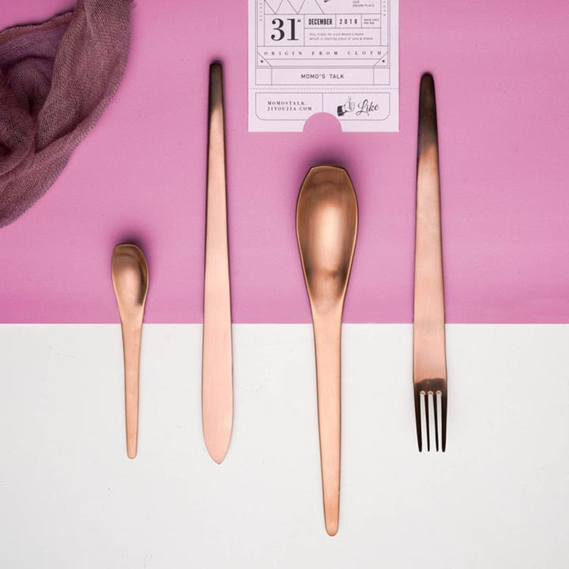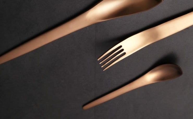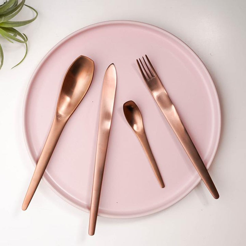 Elevate every dining experience with sleek rose gold-tone stainless steel cutlery. These Japanese-style dining utensils offer eye-pleasing aesthetics, smooth edges, and quality craftsmanship. Frosted rose gold gives this striking set a gorgeous modern finish. 4 pieces set include Knife, Fork, Spoon, and Coffee Spoon. Choose a set of 4 or 16.
