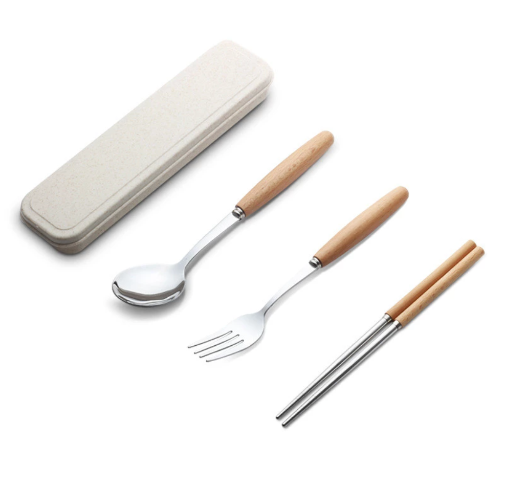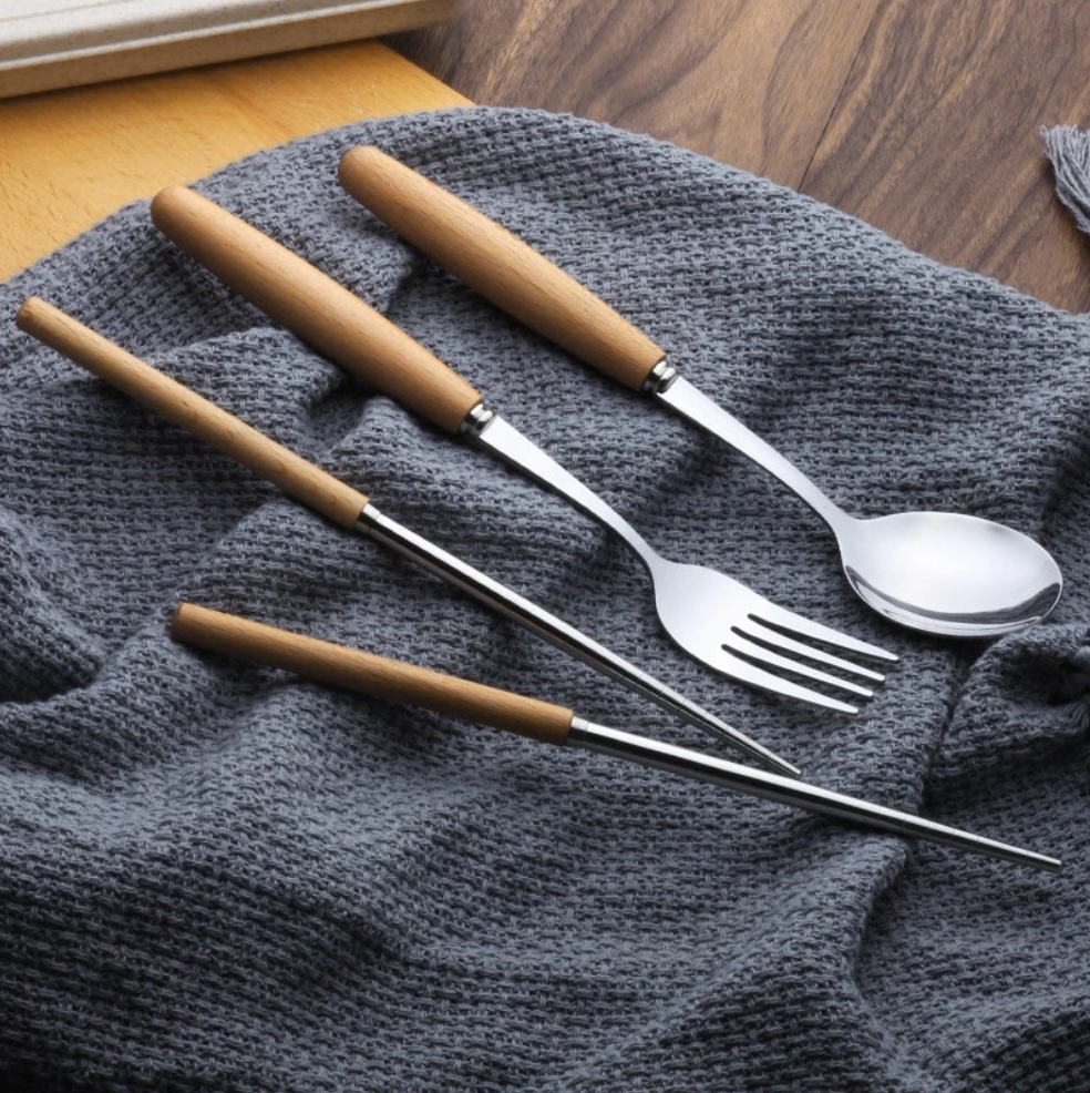 Eco-friendly flatware is a natural choice for the on-the-go. This modern stainless steel flatware, with its wooden handles, allows you to enjoy a proper meal no matter where you may be. Choose 2, 4, or 5 pieces, for travel, work, or camping.