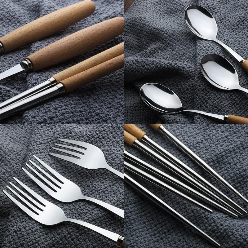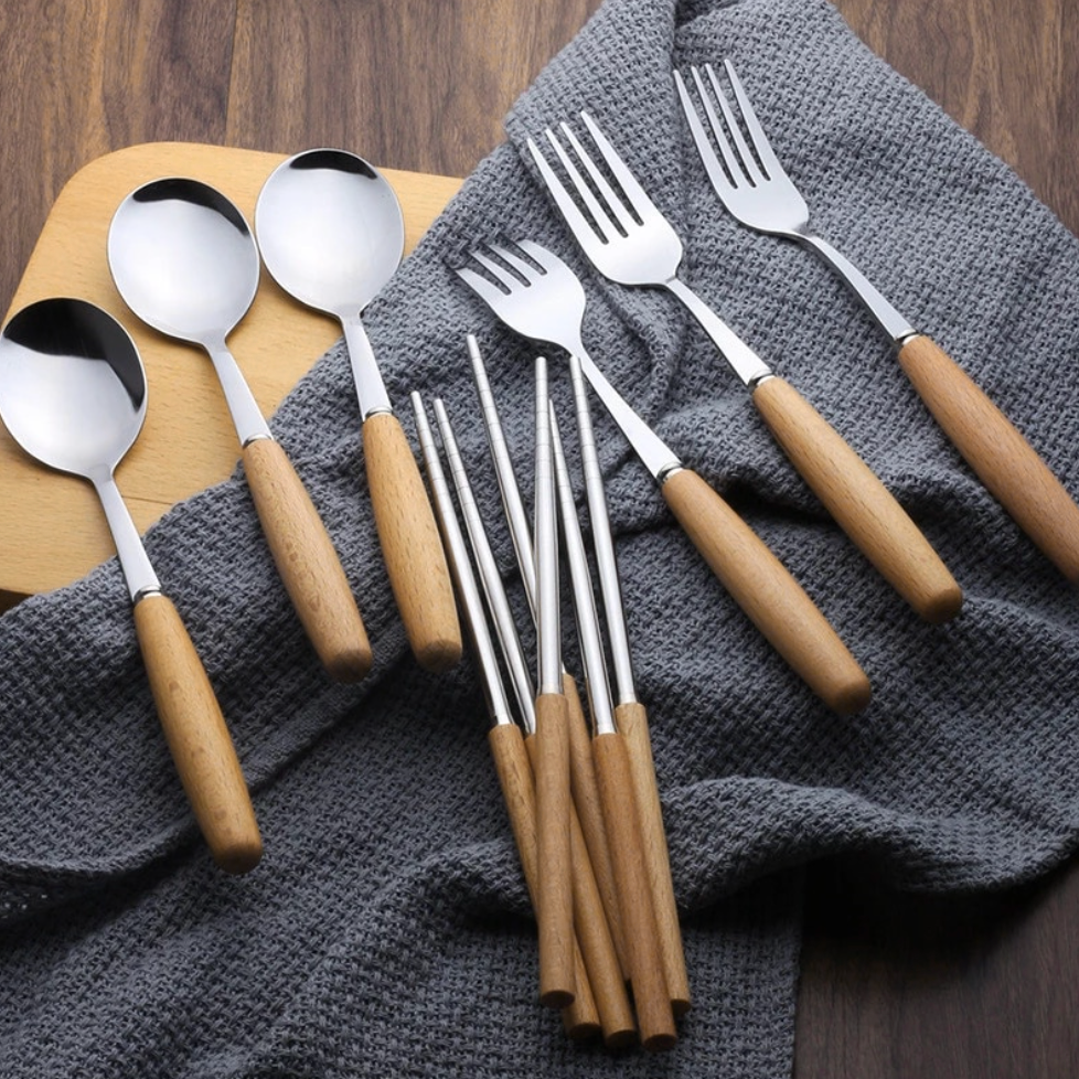 Bring the outdoors in with this set, featuring flatware that evokes a modern rustic look. Each piece is beautifully crafted from stainless steel topped off with a charming wooden handle to add a touch of elegance to any table setting.