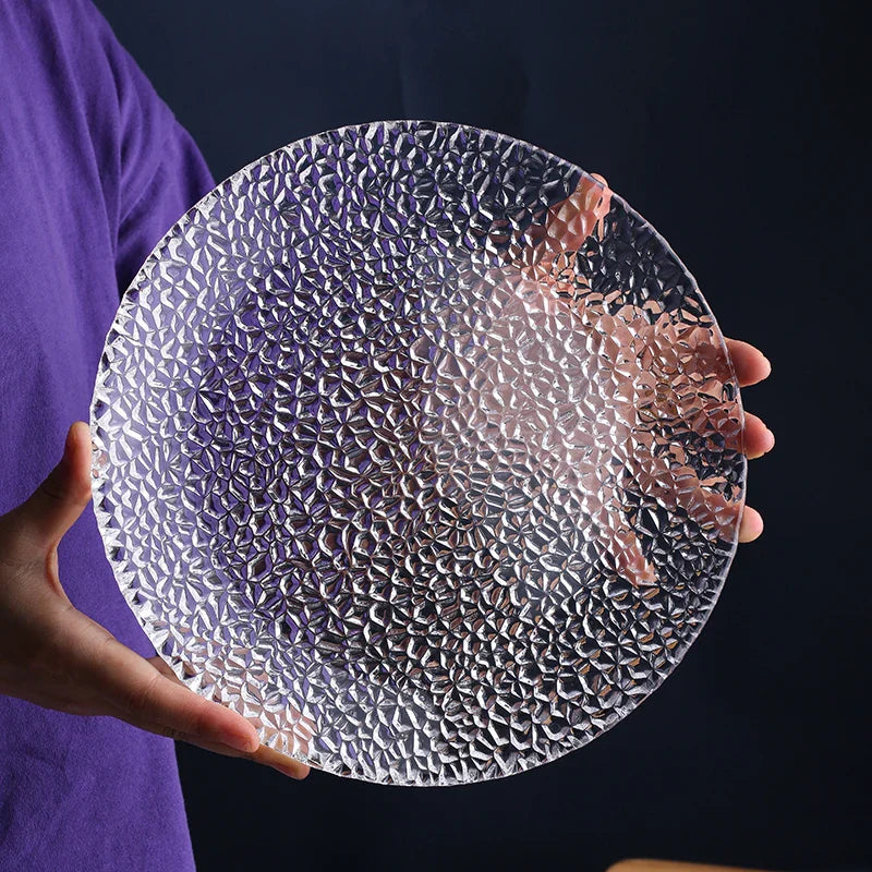Designed to elevate any dining atmosphere, this plate combines beauty with functionality. Its versatile style complements various tableware and is ideal for serving main courses, salads, and appetizers. Perfect for those who appreciate refined details in their home decor, the Rain-Drop Embossed Glass Dinner Plate effortlessly stands out as a chic and timeless choice for all your dining needs.