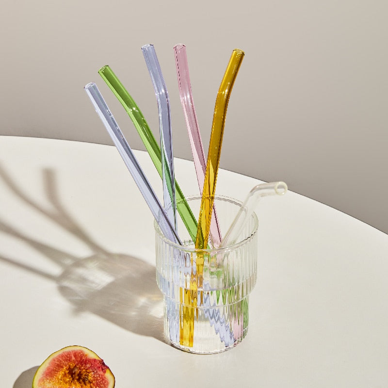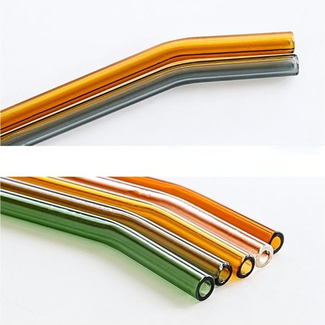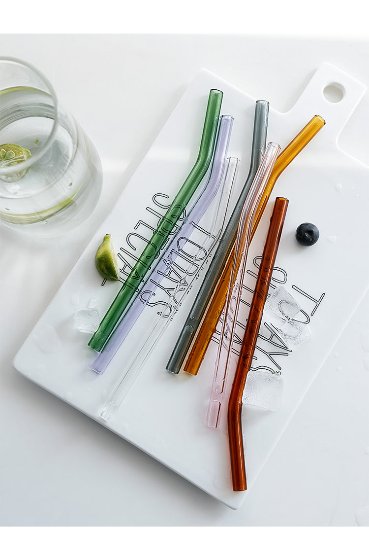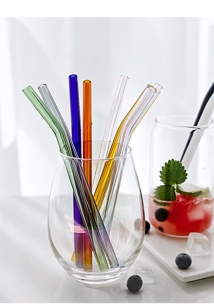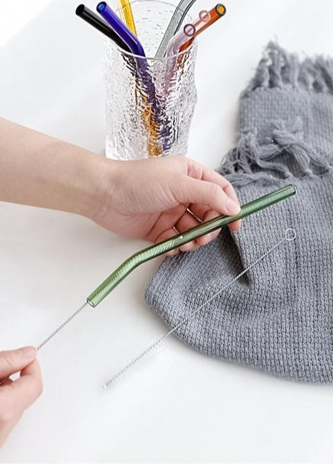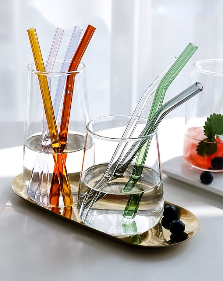 Sip, Sip Hurray! We can all do our part for the environment by replacing plastic straws with these gorgeous Borosilicate glass straws that add color and style to every beverage. Each set consists of 2 straight straws and 2 bent straws, plus a handy cleaning brush. The multicolored Rainbow set consists of 4 bent straws and the cleaning brush. Drink with purpose with eco-friendly reusable straws.