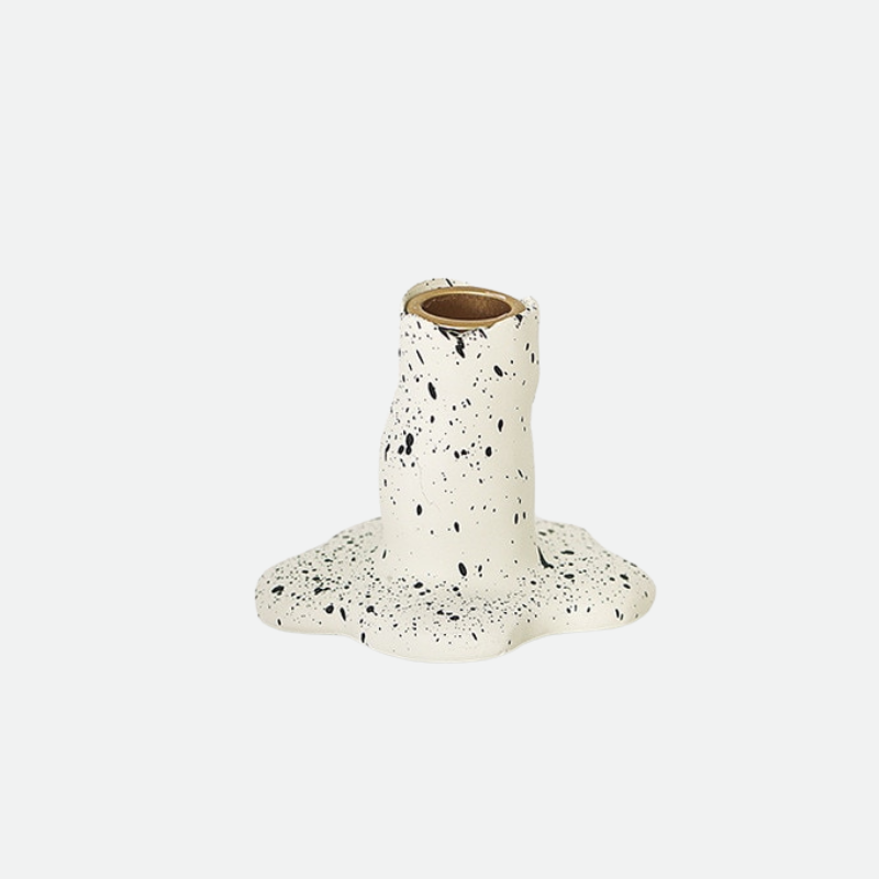 Bring an artful edge to your candlelight with the Spotted Resin Candle Holder. Crafted in a playful sculptural form and finished with painterly speckles, this piece feels like modern art for your tabletop. Its organic curves nod to mid-century design, while the bold, spotted surface adds a contemporary twist that makes it stand out in any setting. Whether styled solo as a centerpiece or paired with spiral or tapered candles for a dramatic display, it instantly turns a simple table into a curated moment. Lightweight yet sturdy, the resin material gives it a smooth, tactile feel while keeping it durable for everyday use.