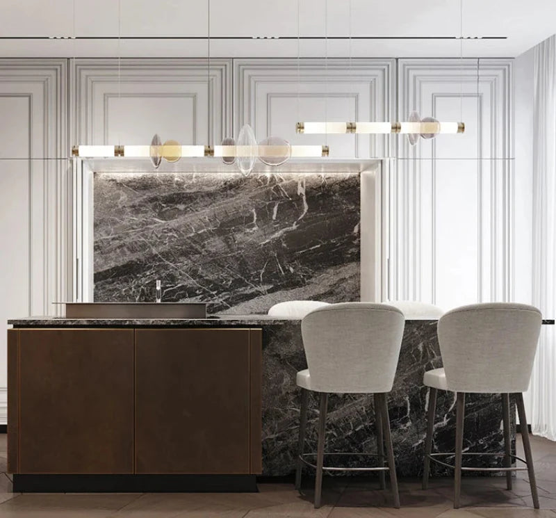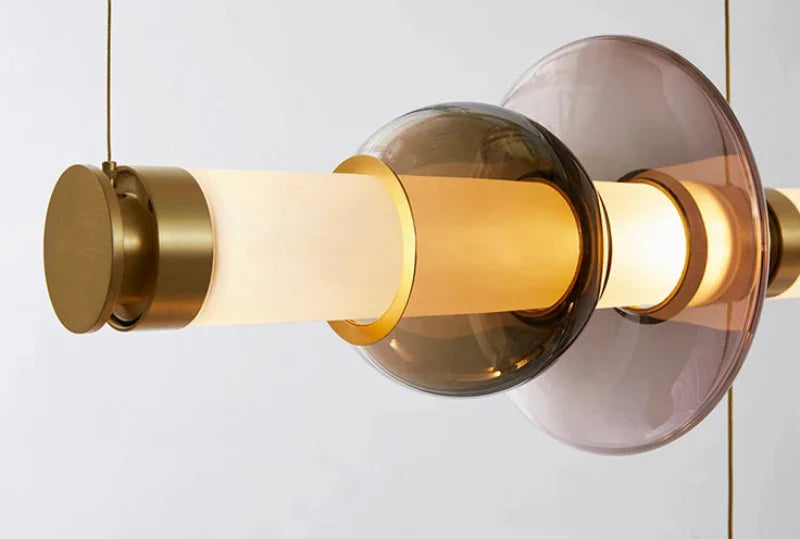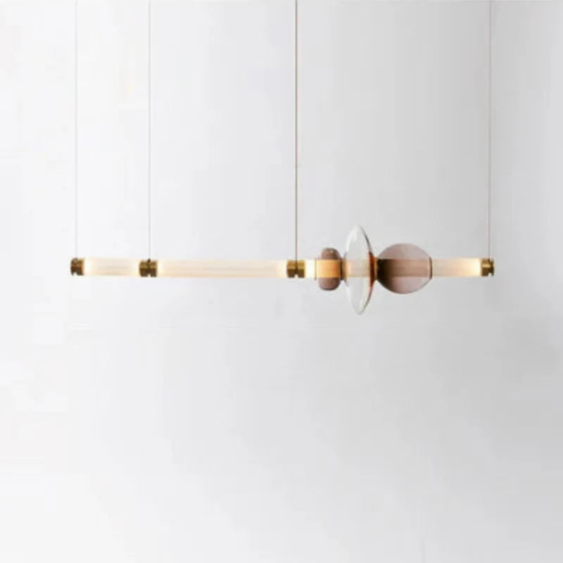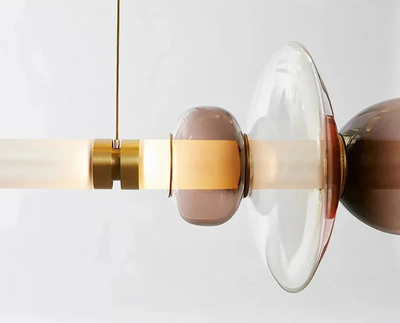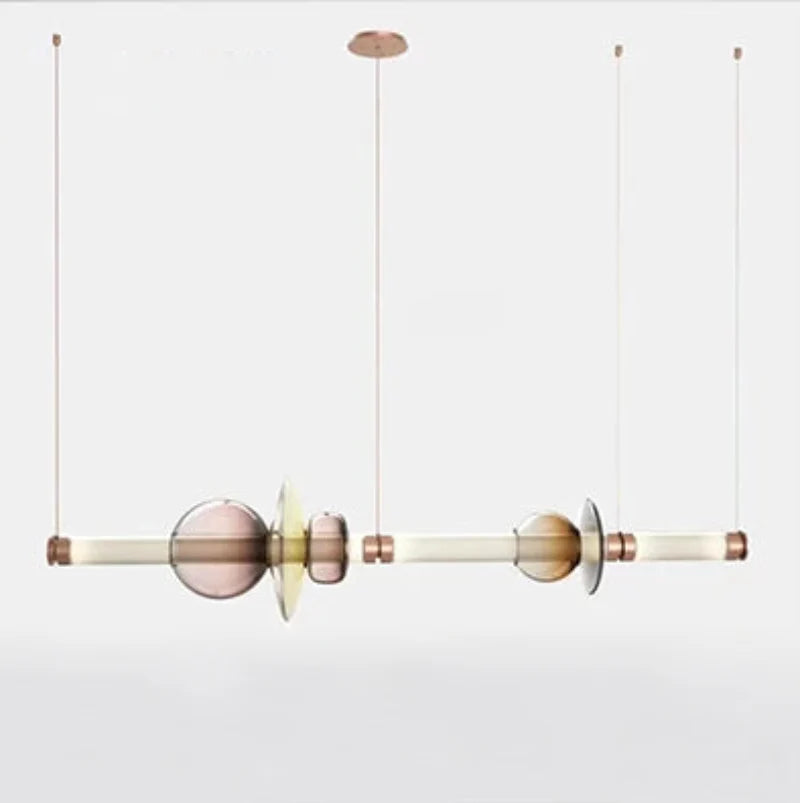 The Stellar Orbit Linear Pendant Light transforms any room with its dynamic and artistic design. This exquisite fixture features a sequence of beautifully crafted glass and metal elements arranged in an elegant linear formation. Ideal for illuminating dining rooms, kitchen islands, or open living spaces, it offers warm, ambient lighting that adds a sophisticated glow to your home while enhancing its modern aesthetic.