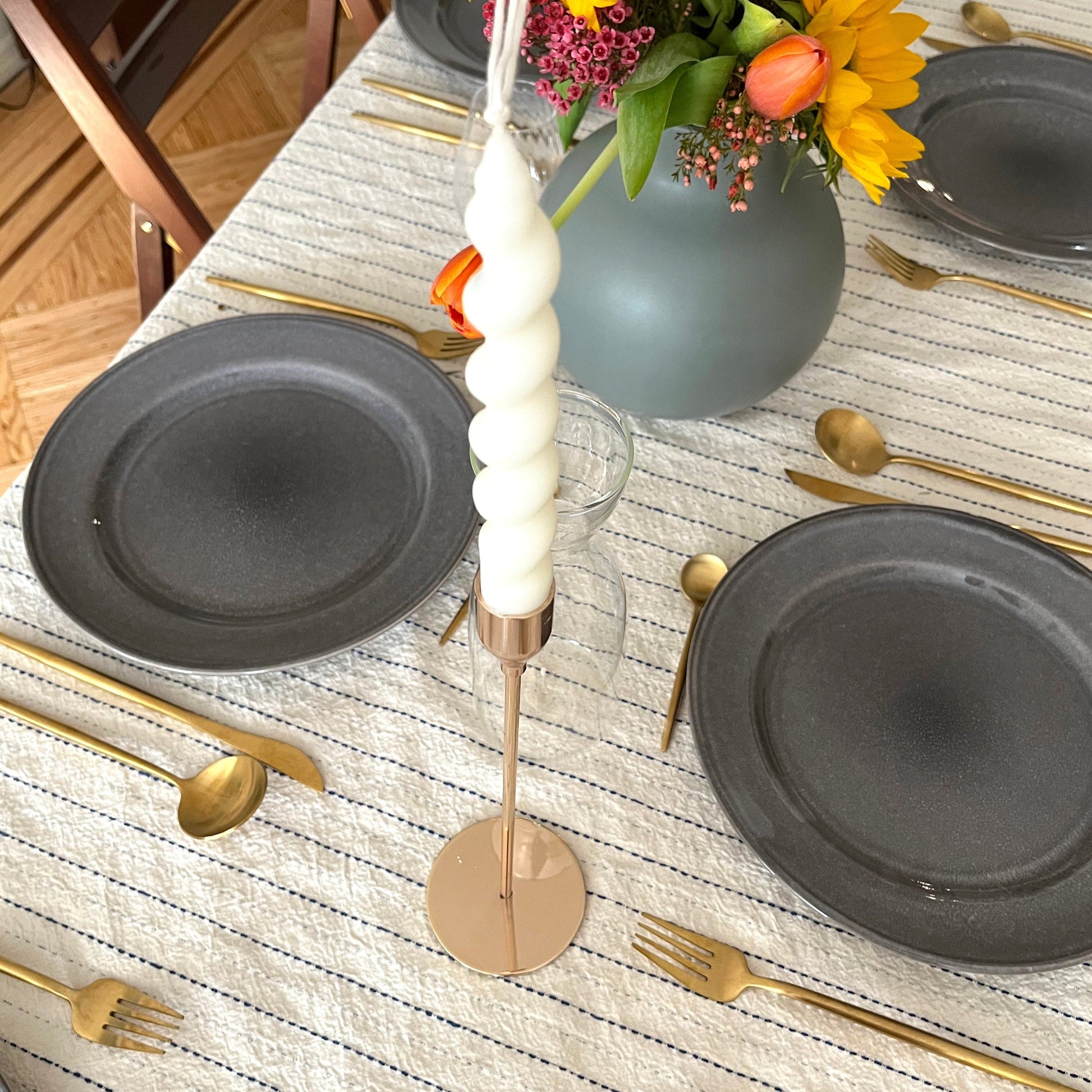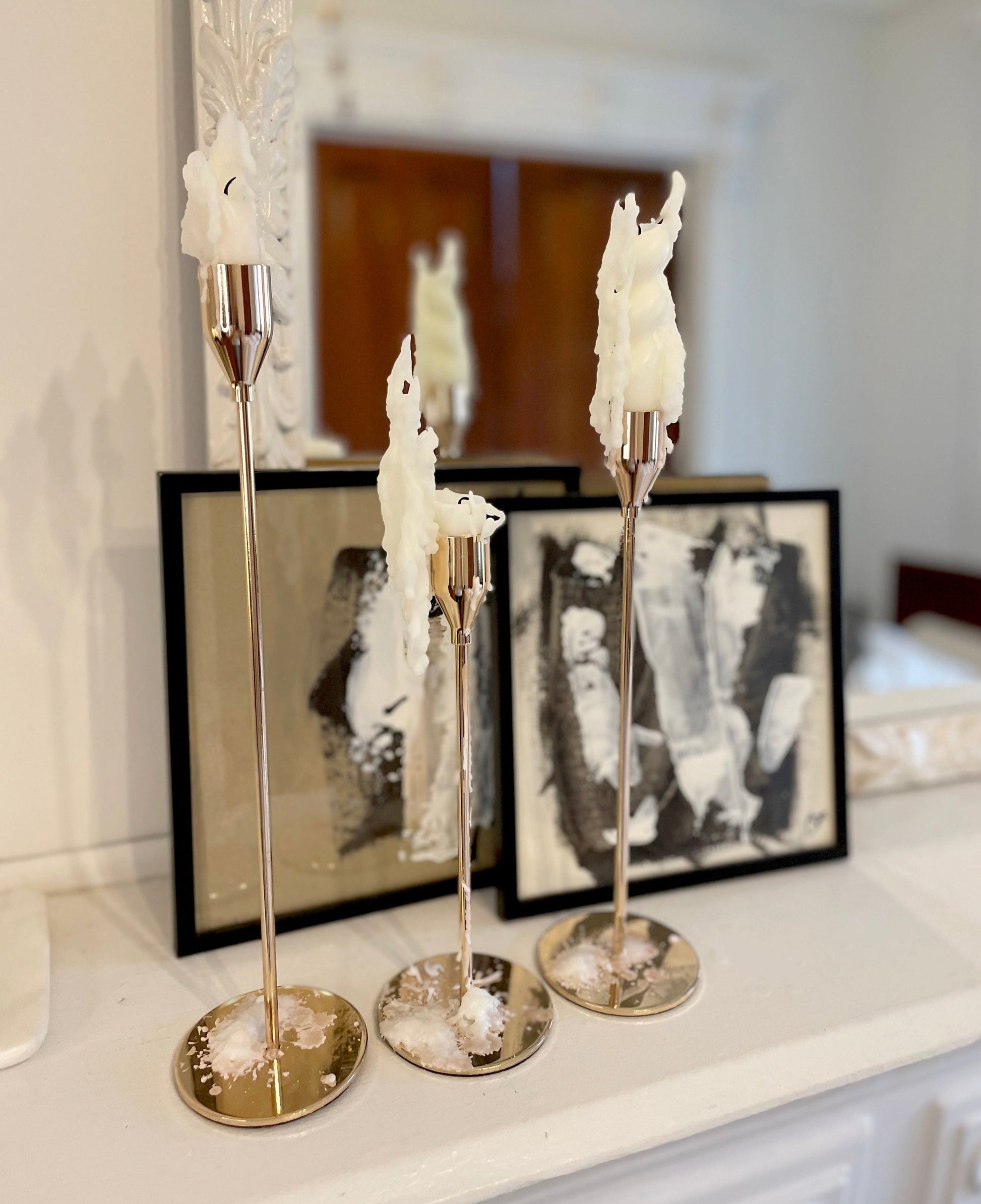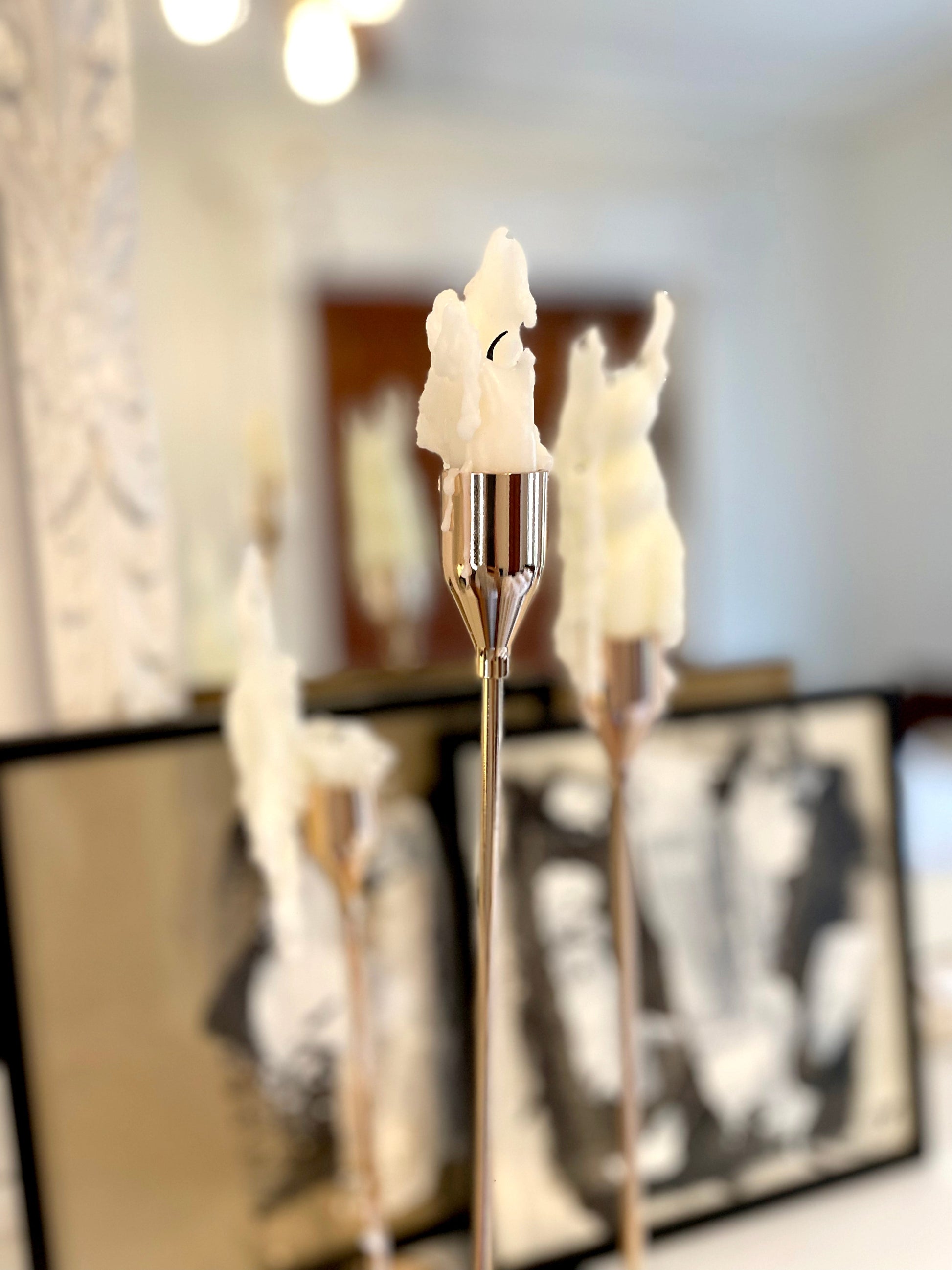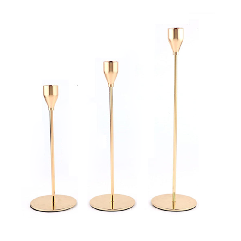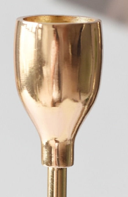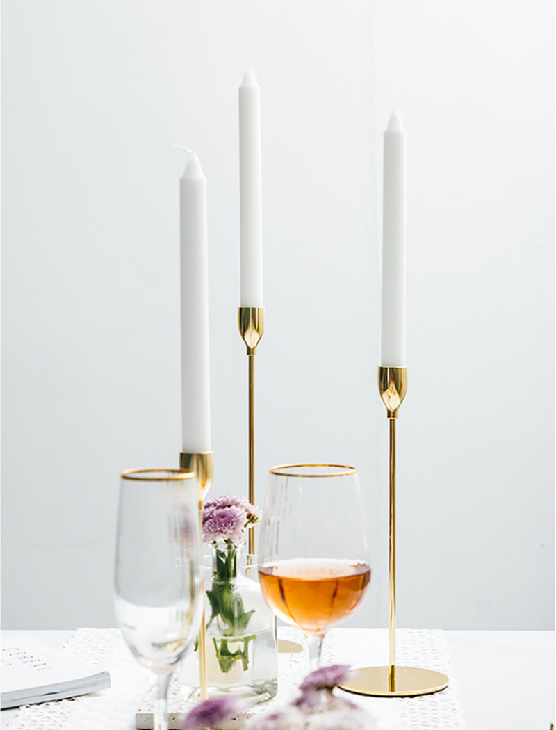 Add a sophisticated touch to your next dinner party with these stunning metal candle holders that ooze vintage charm. Tall and slender, these elegant candle holders will display your taper candles beautifully, offering a magnificent centerpiece on a dining table or to decorate a mantel. Choose sophisticated high gloss finishes of Rose Gold, Champagne, or Silver. Or opt for a matte Black to add modern or rustic charm to your home. Available in three sizes and sold separately. Purchase a trio for a stylish tablescape.
