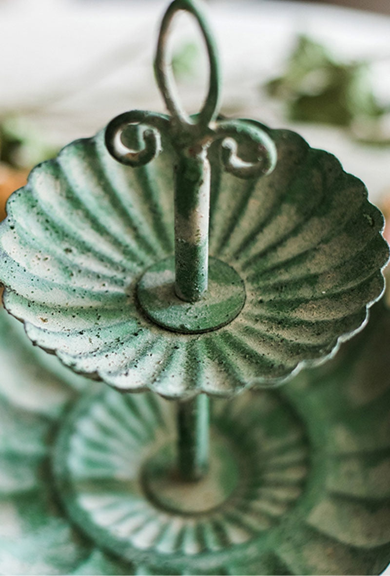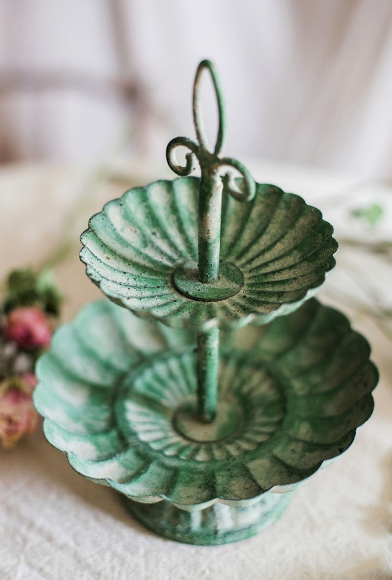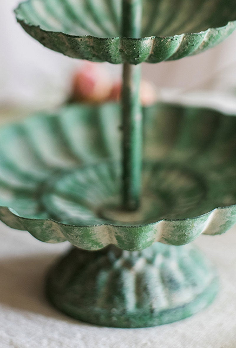 Tiered Trays are an essential accessory in Farmhouse and French Provincial décor, but they also blend with Modern or Contemporary styles. They’re a multipurpose decorative accent for organizing and storage. Not only do tiered trays keep trinkets and treasures contained, they’re ideal for keeping your morning coffee pods or teas handy, for displaying collections and for serving guests. You’ll love how our Vintage Jade Tired Tray brings beauty to a dresser top, bathroom vanity or kitchen counter. Use this versatile tray to hold jewelry or makeup. It has a vintage look and feel and adds a touch of elegance to any setting. Crafted of high-quality cast iron, this chic 2-tiered round tray features a pretty scalloped design and fleur-de-lys handle. The stunning jade color gives this tray additional antique flair. It’s an eye-catching way to showcase your favorite items and is lovely for serving appetizers and desserts when entertaining. Presentation is everything and this elegant tray adds visual appeal wherever it is displayed.