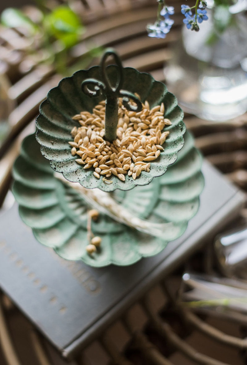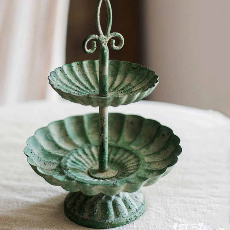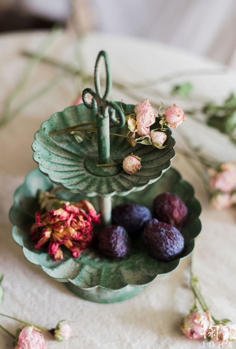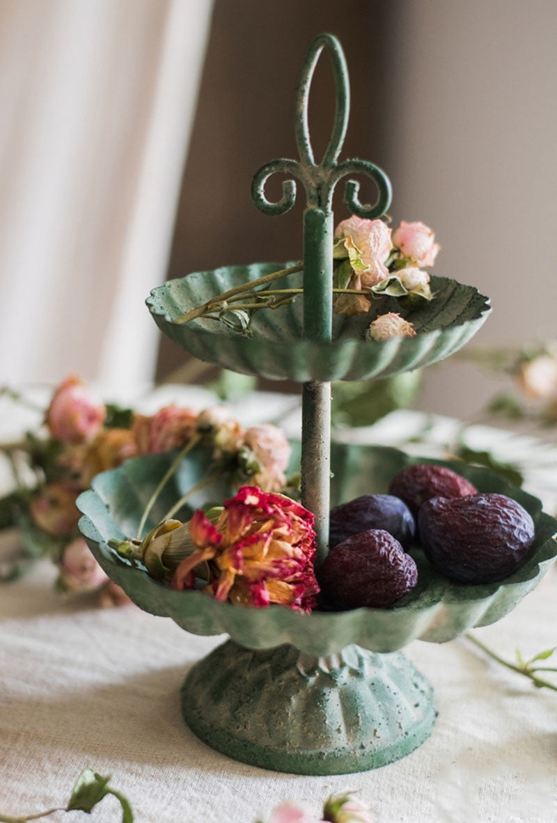 Tiered Trays are an essential accessory in Farmhouse and French Provincial décor, but they also blend with Modern or Contemporary styles. They’re a multipurpose decorative accent for organizing and storage. Not only do tiered trays keep trinkets and treasures contained, they’re ideal for keeping your morning coffee pods or teas handy, for displaying collections and for serving guests. You’ll love how our Vintage Jade Tired Tray brings beauty to a dresser top, bathroom vanity or kitchen counter. Use this versatile tray to hold jewelry or makeup. It has a vintage look and feel and adds a touch of elegance to any setting. Crafted of high-quality cast iron, this chic 2-tiered round tray features a pretty scalloped design and fleur-de-lys handle. The stunning jade color gives this tray additional antique flair. It’s an eye-catching way to showcase your favorite items and is lovely for serving appetizers and desserts when entertaining. Presentation is everything and this elegant tray adds visual appeal wherever it is displayed.