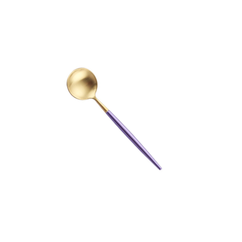 Defining the refined side of dining, this elegant collection of stainless steel flatware is crafted in a luxurious gold metal finish. Featuring violet handles for a touch of elegance, this flatware set is the perfect blend of traditional and contemporary elements that speak to refined taste.