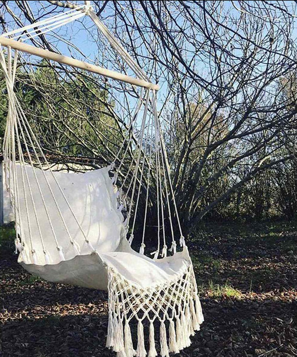 Grab the best seat (in or out) of the house. This fabulous garden swing chair has bohemian vibes. Crafted of canvas, cotton and wood, this versatile swing chair is the ultimate piece of furniture that can be used indoors or in the garden. Hang it on a porch or from a tree in the yard. Attach it in a playroom for a cozy spot for kids to relax or read. In the family room, this macrame hammock adds cool vibes and offers additional seating when teens have their friends over. It’s also a great spot for adults to have a little peace and quiet while enjoying a morning coffee or afternoon cup of tea in the garden. Multi-rope braids and handmade tassel decorations give this macrame chair its retro charm. Constructed to be strong and durable, our Macrame Hammock Outdoor Garden Swing Chair has a solid canvas seat and back for strong weight resistance. Hang this delightful swing chair from the wooden rod and get comfortable.